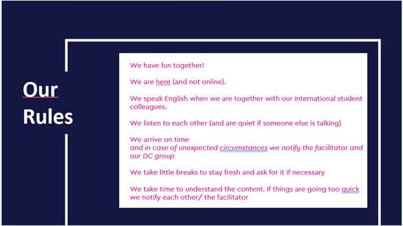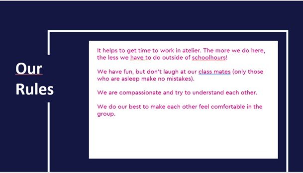 - In de volgende les haal ik de slide waar we onze regels opgeschreven hebben er weer bij. Zo worden we er aan herinnerd. Meestal is dit genoeg, maar mocht ik later merken dat één van onze regels niet nageleefd wordt, dan kan ik studenten er weer aan herinneren.